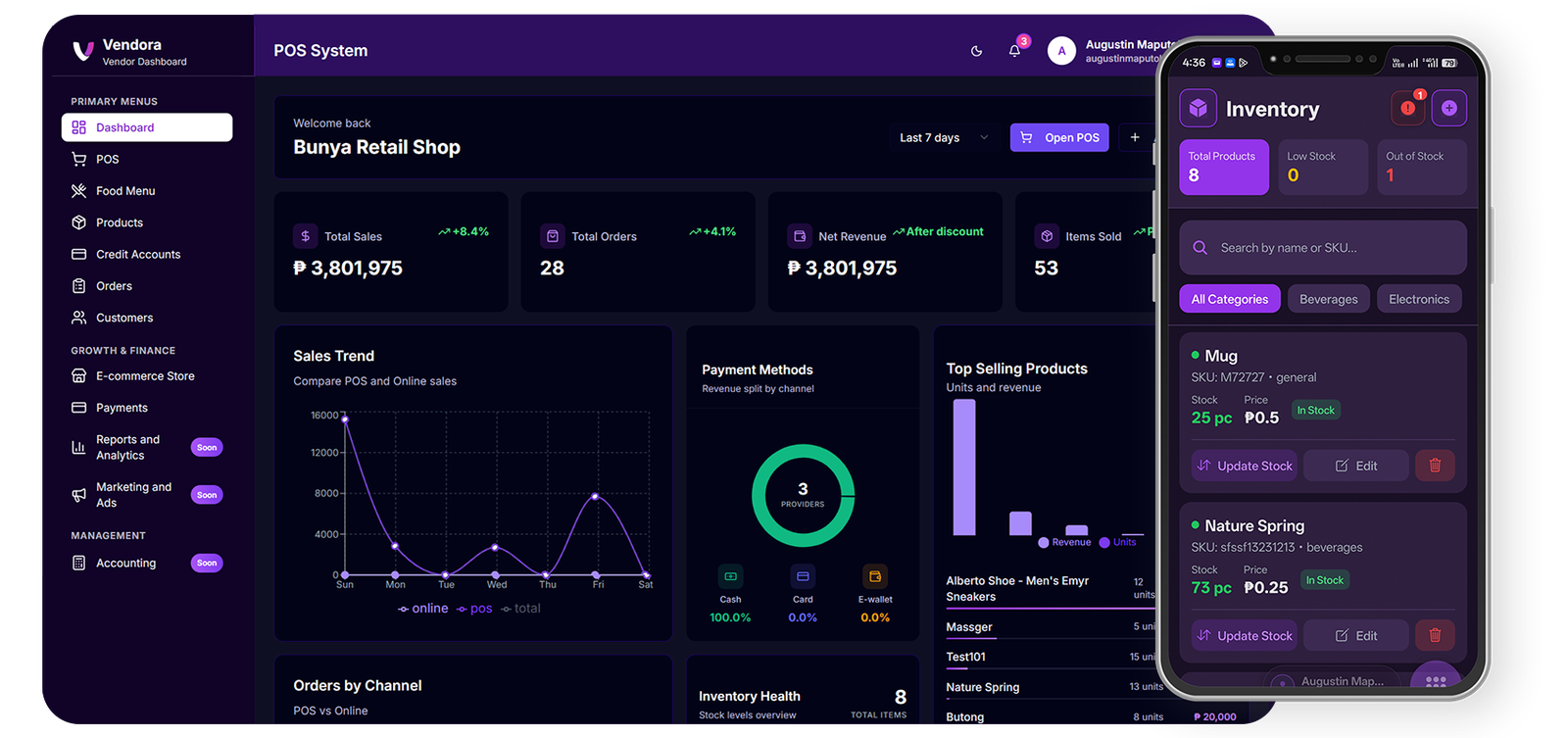 Vendora POS is an all in one point of sale system designed to help businesses manage both in store and online sales from a single platform. It allows you to process transactions, monitor inventory, generate sales reports, and manage your products without switching between different tools.